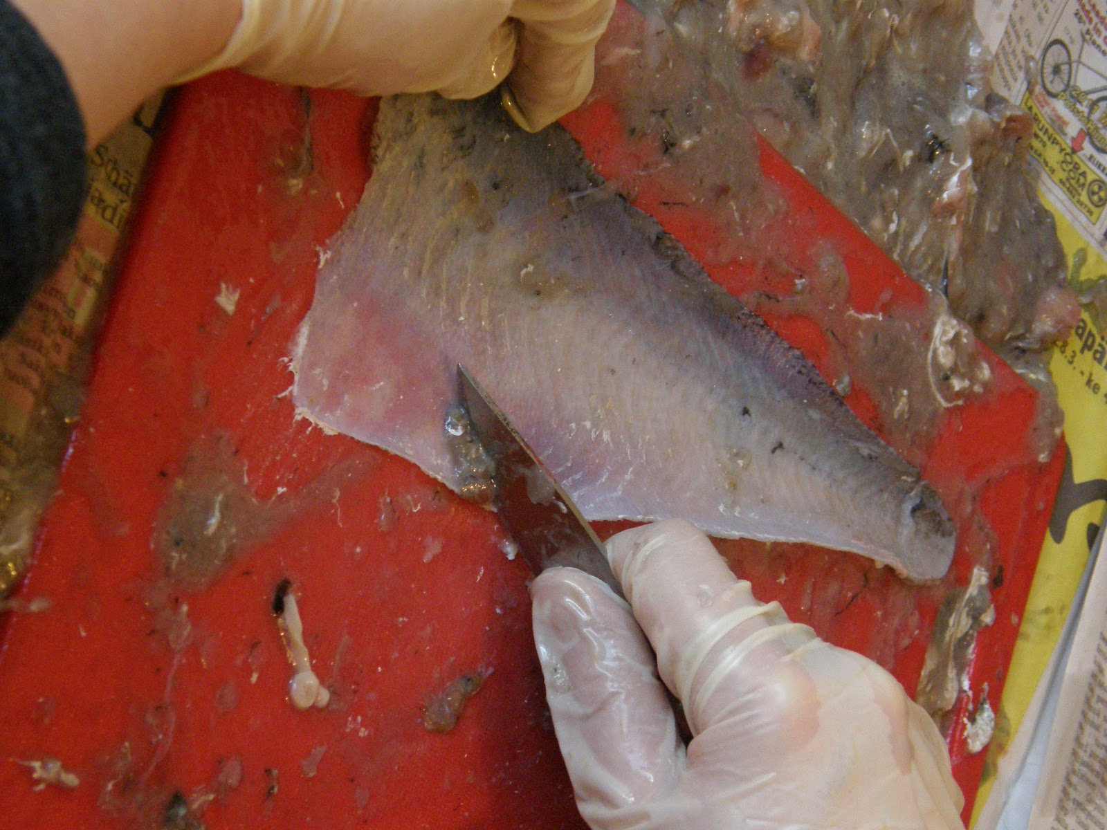 Alussa siis pakasteessa olleet nahat (made, kuha, kirjolohi, taimen, hauki) sulatetaan kevyesti ja aloitetaan kalvojen ja rasvojen kaavinta esim. puukolla. Kun nahat ovat puhtaat, liotetaan niitä kylmässä (veden lämpötila ei saa missään vaiheessa kohota yli 20 asteiseksi, ettei pilaantuminen käynnisty) astianpesuainevedessä ja sitten huuhdellaan vielä vedessä.